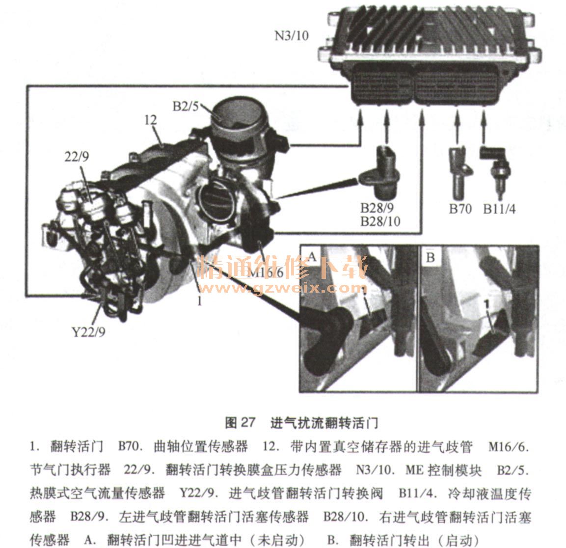 可變進氣歧管作動電磁閥Y22/6和進氣擾流翻板作動電磁閥Y22/9位于進氣歧管前部下端,線圈電阻大約30Ω,通過上面的蓋與大氣相通。兩個電磁閥均受控于發(fā)動機控制模塊。