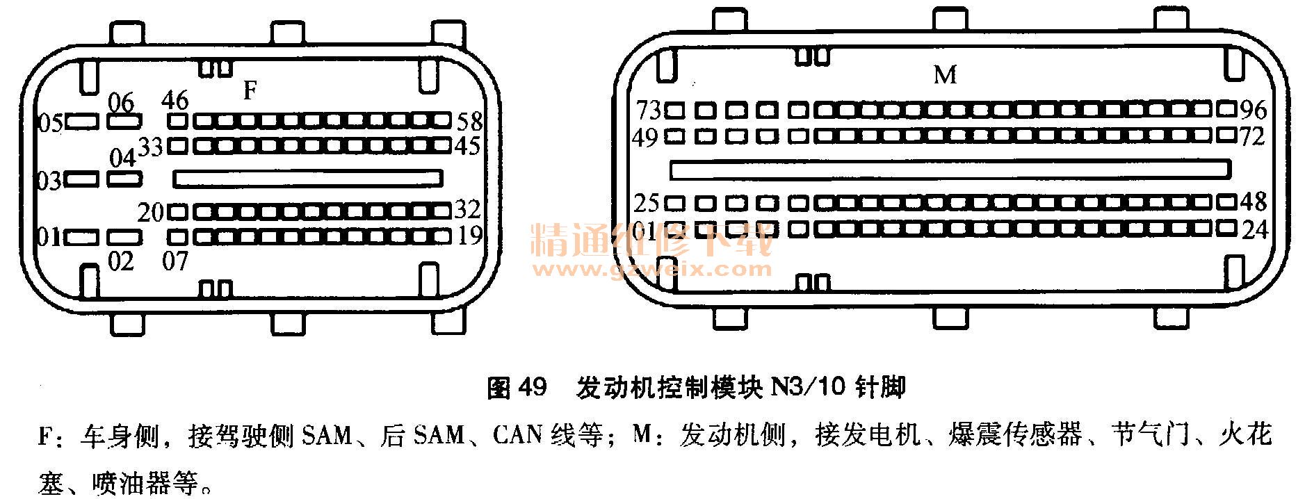 發(fā)動機控制模塊N3/10針腳如圖49所示。