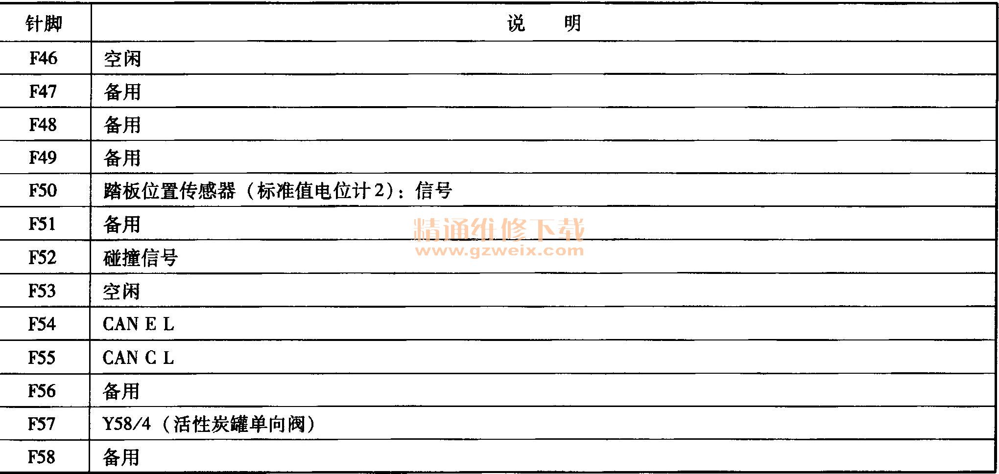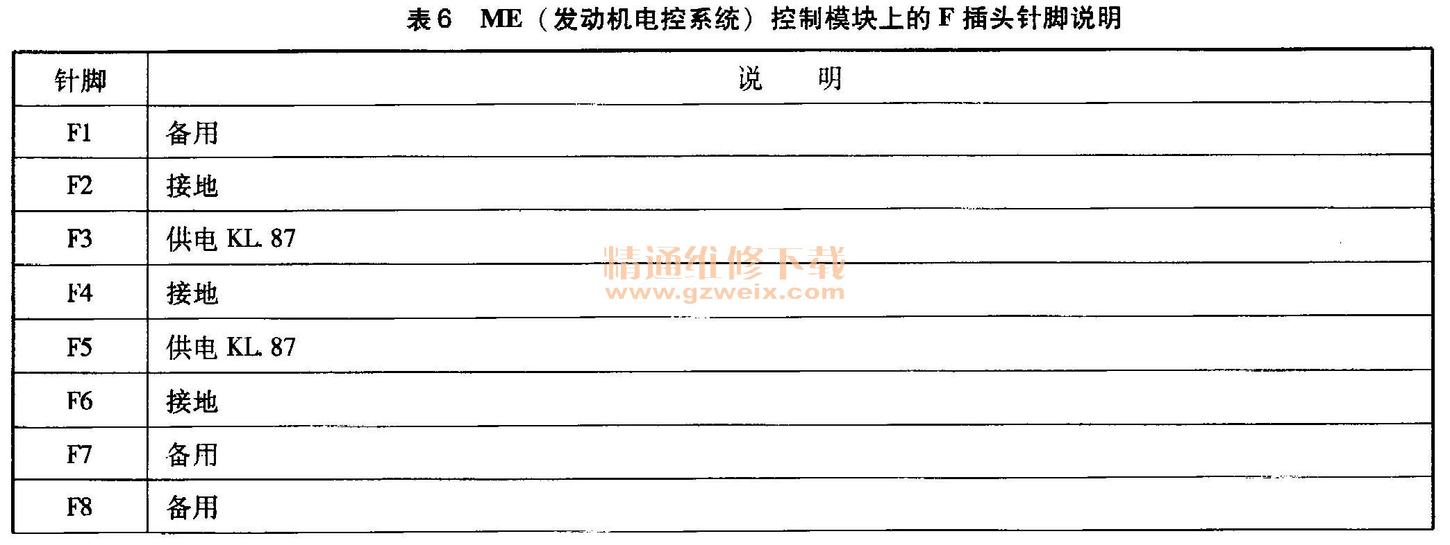 ME(發(fā)動機電控系統(tǒng))控制模塊上的F插頭(車身側(cè))針腳說明,如表6所示。