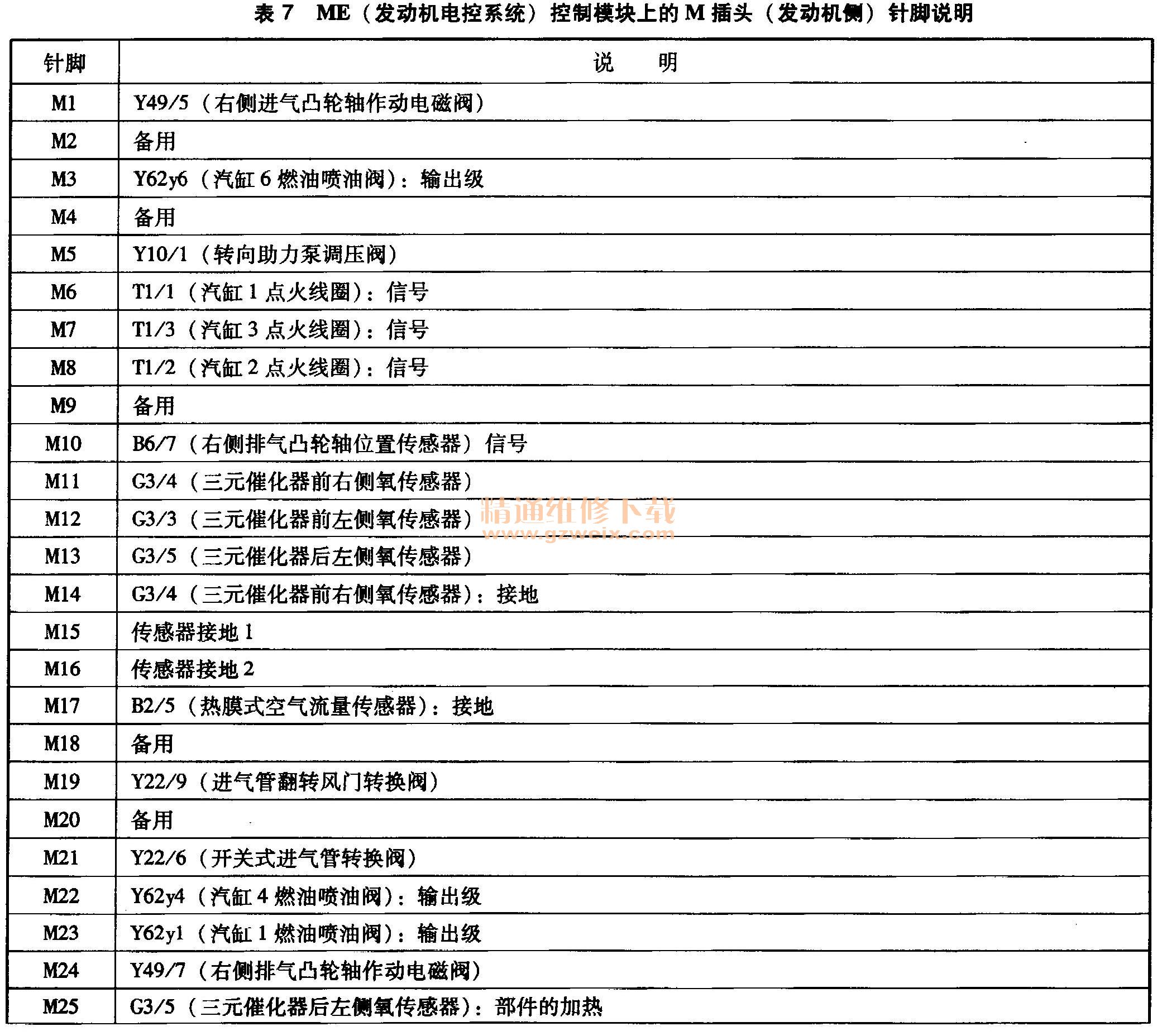 ME(發(fā)動機電控系統(tǒng))控制模塊上的M插頭(發(fā)動機側(cè))針腳說明,如表7所示。