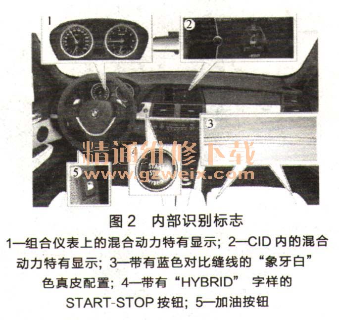 從外部看,BMW ActiveHybrid車輛與其他BMW車輛有多處不同。其中包括體現(xiàn)創(chuàng)新BMW ActiveHybrid技術(shù)的“Bluewater金屬漆”獨(dú)特外觀.這種外觀特色僅用于ActiveHybrid車輛。當(dāng)然客戶也可以為其AciveHybrid車輛選擇其他特色,如圖1所示。