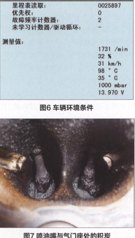 雜質(zhì)較多的燃油必然導(dǎo)致噴油嘴與氣門座處產(chǎn)生較多積炭(見圖7)。現(xiàn)在燃油及油路的問題已經(jīng)解決,技師決定清潔噴油嘴及氣門座處的積炭。