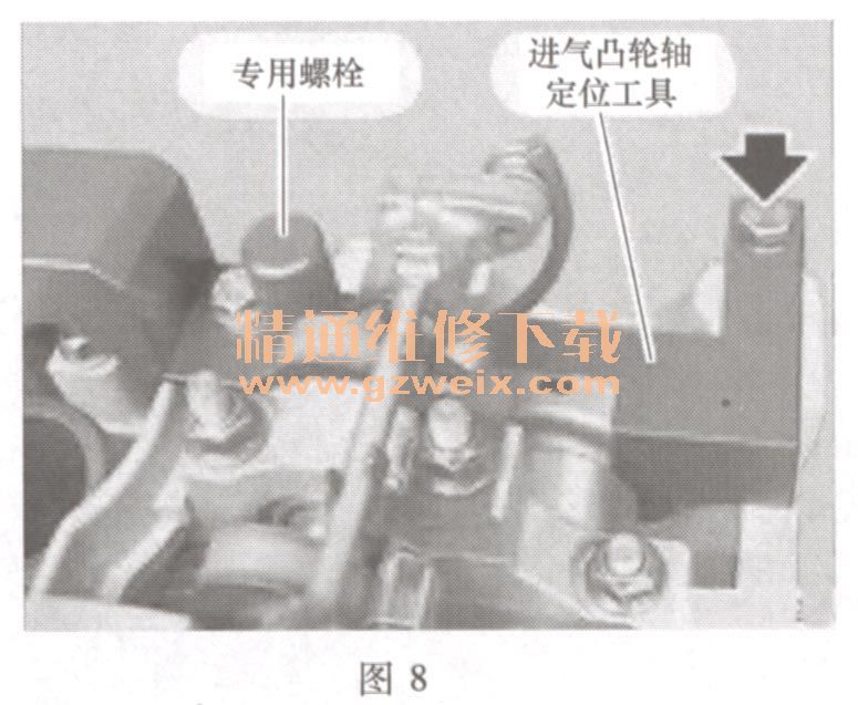 (5)如圖8所示,手動(dòng)擰緊專用螺栓,并在氣缸蓋上擰緊進(jìn)氣凸輪軸定位工具的螺栓。