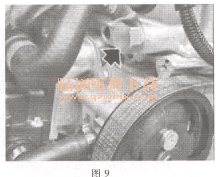 (7)如圖10所示,手動(dòng)裝上正時(shí)鏈預(yù)緊工具,但暫時(shí)不要預(yù)緊正時(shí)鏈。