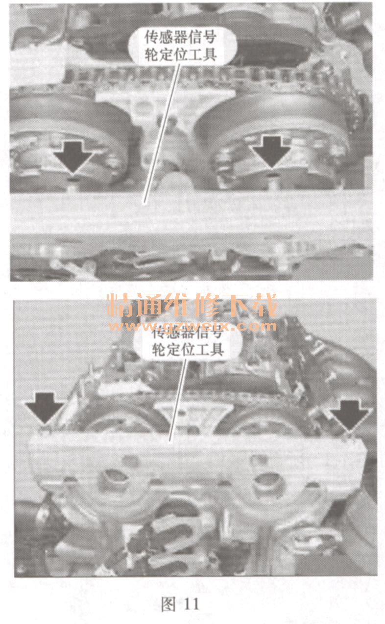 (16)拆下進(jìn)、排氣凸輪軸定位工具。