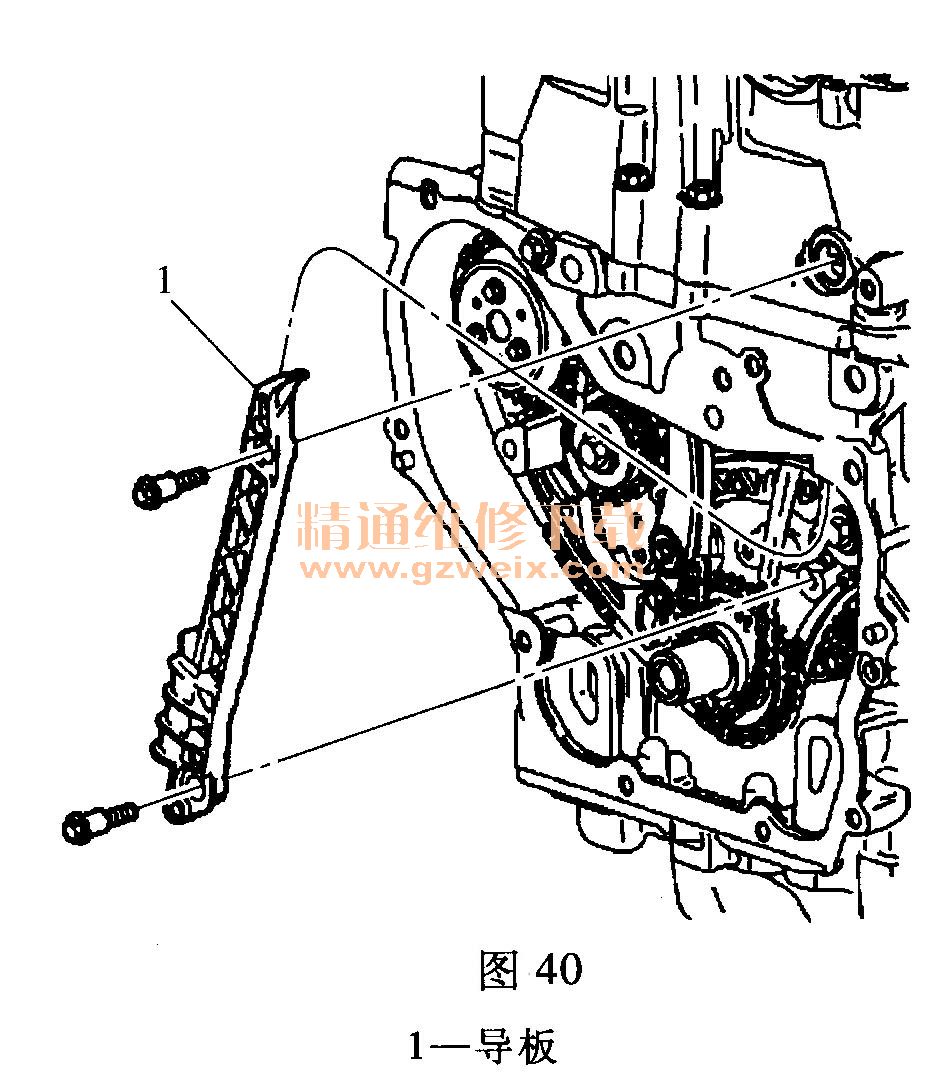 (11)拆下正時鏈條導(dǎo)板螺栓,取下正時鏈條導(dǎo)板1,如圖40所示。