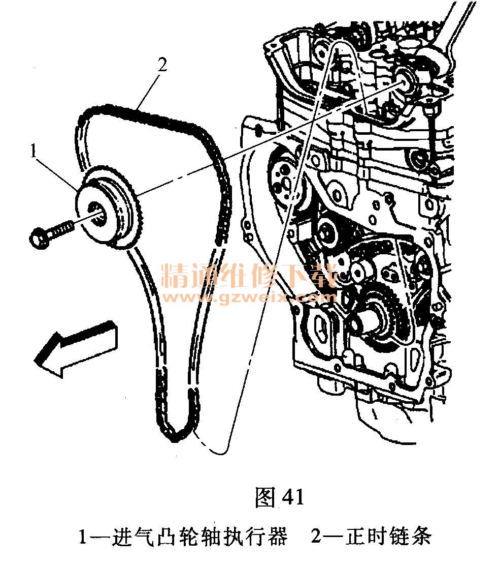 (12)用扳手固定進(jìn)氣凸輪軸,通過氣缸蓋頂部,拆下進(jìn)氣凸輪軸執(zhí)行器螺栓、進(jìn)氣凸輪軸執(zhí)行器1和正時鏈條2,報廢螺栓,如圖41所示。