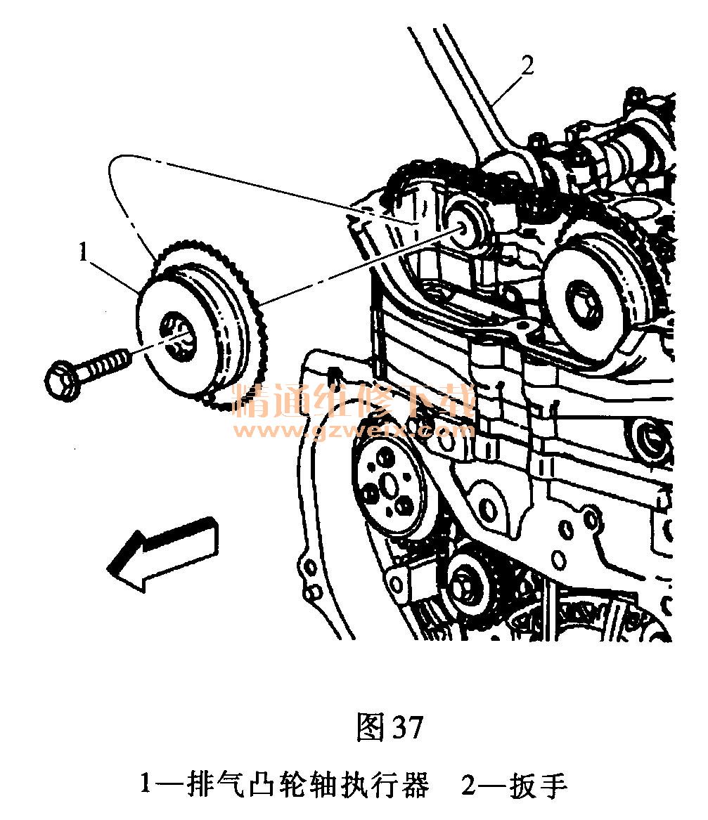 (7)將六角頭定位在排氣凸輪軸上并用扳手2固定,如圖37所示。