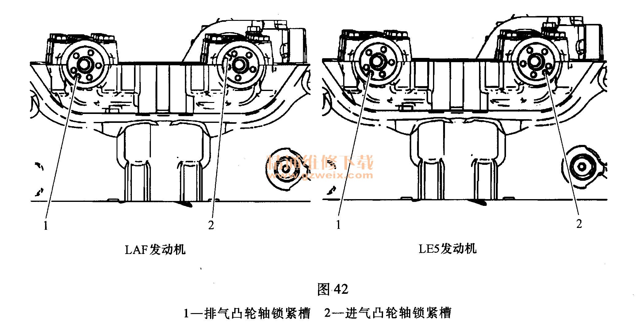 (13)在排氣凸輪軸執(zhí)行器鎖緊槽1和進(jìn)氣凸輪軸鎖緊槽2與氣缸蓋對齊處進(jìn)行標(biāo)記,如圖42所示。