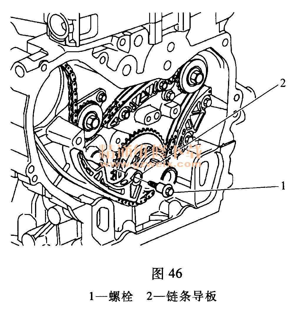 (18)拆下可調(diào)節(jié)平衡軸鏈條導(dǎo)板螺栓和導(dǎo)板,如圖46所示。