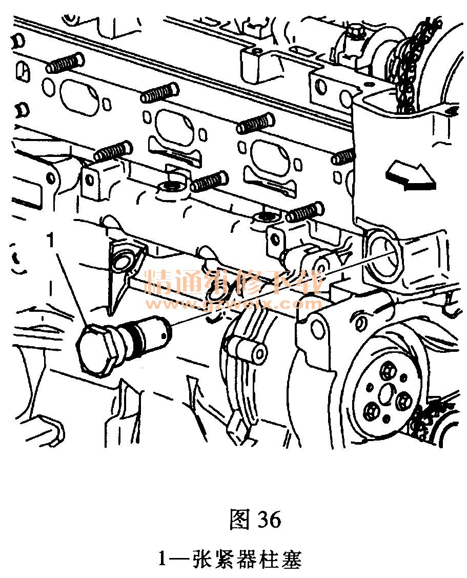 (6)拆下正時鏈條張緊器柱塞1,如圖36所示。
