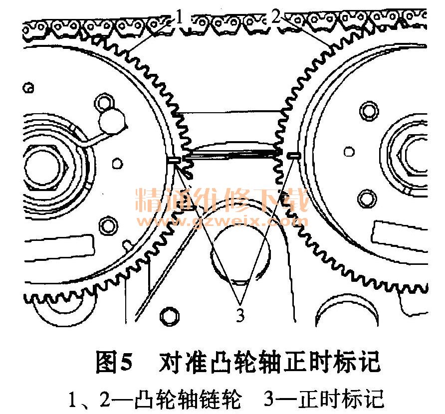 注意:如果找不到正時(shí)鏈的電鍍聯(lián)桿,要想再次使用此鏈條,則應(yīng)在拆卻之前事先在正時(shí)鏈的聯(lián)桿所對(duì)應(yīng)的正時(shí)標(biāo)記上標(biāo)上記號(hào),如圖3所示。