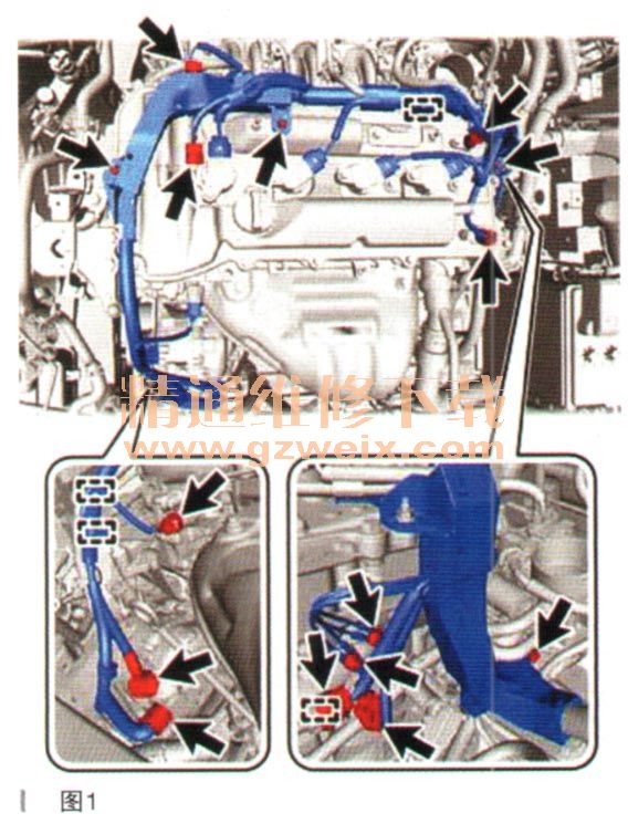 斷開連接器和卡夾,拆下螺栓和螺母并從發(fā)動機上斷開發(fā)動機線束。如圖1所示。