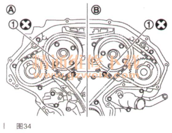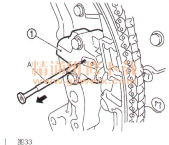 ⑤安裝正時(shí)鏈條張緊器(初級(jí))(如圖33中1所示)。完全清除正時(shí)鏈條張緊器(初級(jí))的背部和安裝表面灰塵和臟污。