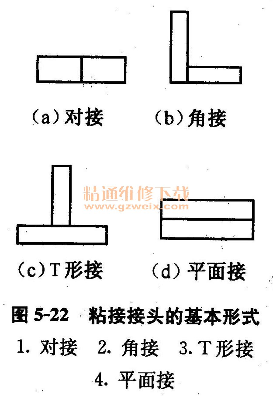 (3)粘接接頭的設(shè)計(jì)形式及特點(diǎn)任何粘接接頭不論多么復(fù)雜,都可以簡化為四種基本形式,如圖5-22所示。