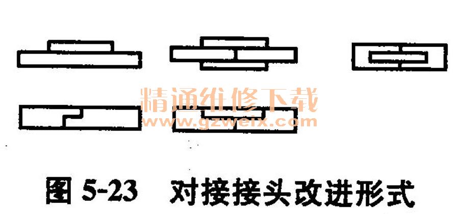 ①對接接頭。它的粘接面積小,除拉力外任何方向的都容易形成不均勻扯離力而造成應(yīng)力集中,所以粘接強(qiáng)度低,一般不采用。對接接頭可采用改進(jìn)形式,如圖5-23所示。