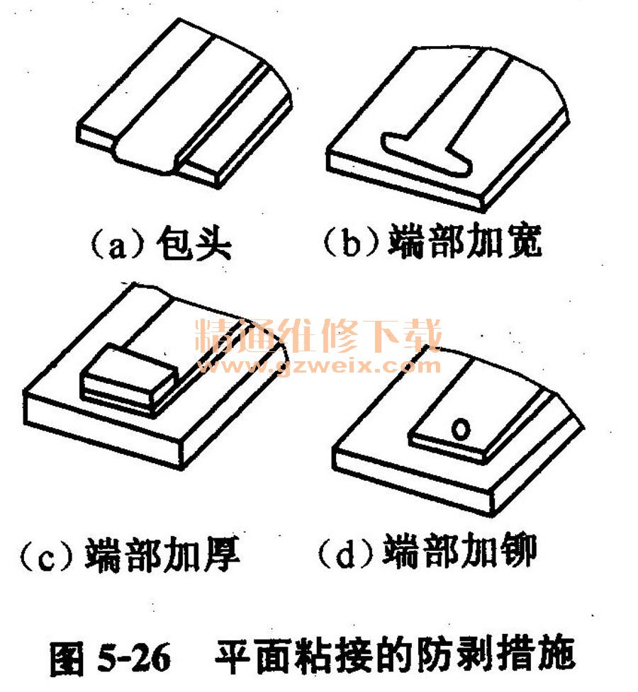 ④平面粘接。它的粘接面積大,粘接強(qiáng)度高,當(dāng)柔性材料和剛性材料之間粘接時,應(yīng)在粘接的邊緣采取防止剝離破壞的措施,如圖5-26所示。
