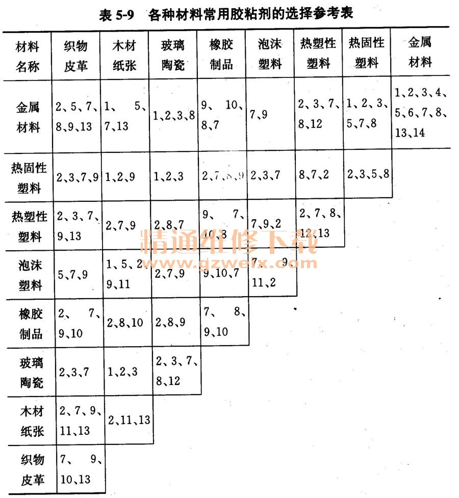 各種材料常用膠粘劑的選擇參考方案見表5-9。