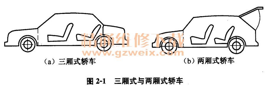 ②按車(chē)身廂體結(jié)構(gòu)分類。轎車(chē)根據(jù)車(chē)身廂體結(jié)構(gòu)可分為三廂式和兩廂式轎車(chē)兩種,如圖2-1所示。三廂式是一種最為流行的有代表性的車(chē)型,車(chē)身為封閉、剛性結(jié)構(gòu),有四個(gè)以上側(cè)窗、兩排以上座位和兩個(gè)以上車(chē)門(mén)。由于發(fā)動(dòng)機(jī)室、乘客室、行李箱分段隔開(kāi)形成相互獨(dú)立的三段布置,故稱之為三廂式轎車(chē)(如圖2-1 a所示)。兩廂式轎車(chē)后部形狀按較大的內(nèi)部空間設(shè)計(jì),將乘客室與行李箱布置在同一段,故稱之為兩廂式轎車(chē)(如圖2-1b所示)。