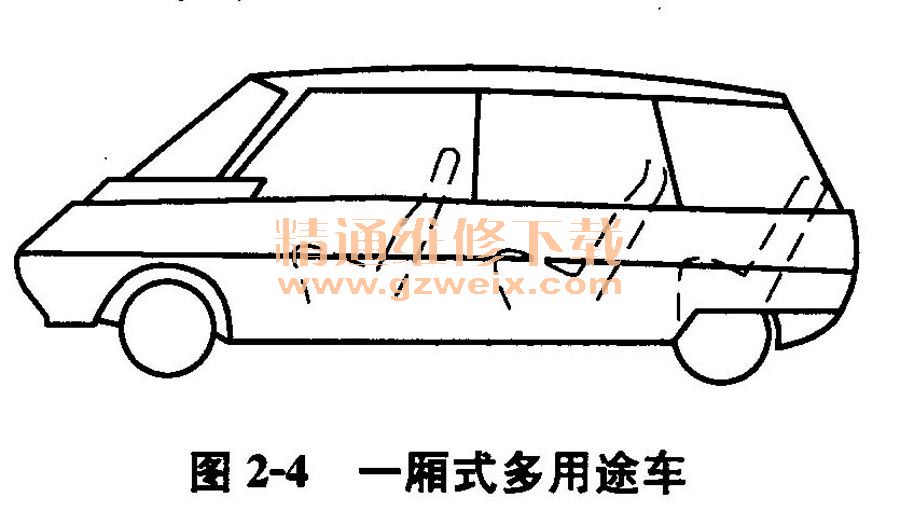 ④變型車(chē)身。轎車(chē)有很多種變型車(chē),主要是指車(chē)身部分的改變。例如,使折背式車(chē)身頂蓋向后延到車(chē)尾的二廂式旅行車(chē),以及使駕駛?cè)俗吻耙频囊粠蕉嘤猛拒?chē)等,如圖2-3和圖2-4所示。