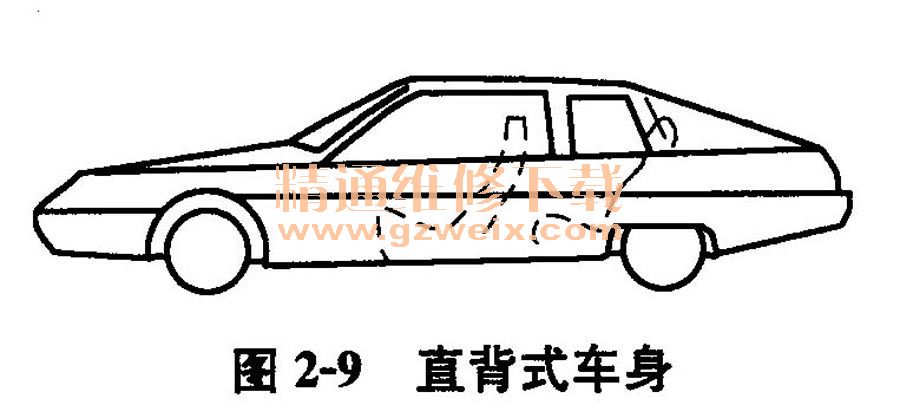(2)直背式車(chē)身 這種車(chē)身的后風(fēng)窗和行李箱連接近似平直,比折背式更趨流線型,有利于降低空氣阻力,且使后行李箱的空間加大。這種車(chē)型也叫做快背式、溜背式車(chē)身等,如圖2-9所示。