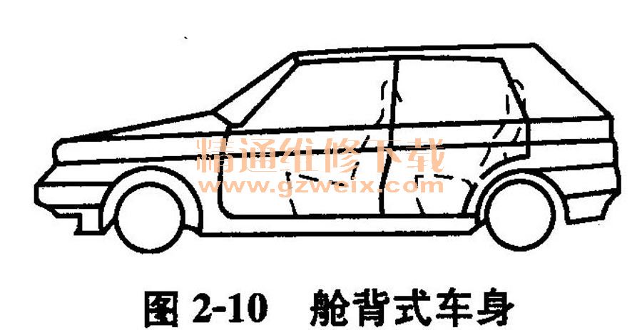 (3)艙背式車(chē)身 這種形式的車(chē)身頂蓋較折背式長(zhǎng),后背角度比直背式小,后行李箱與后窗演變?yōu)橐粋(gè)整體的背部車(chē)門(mén)。這種車(chē)型也叫半快背式車(chē)身,如圖2-10所示。