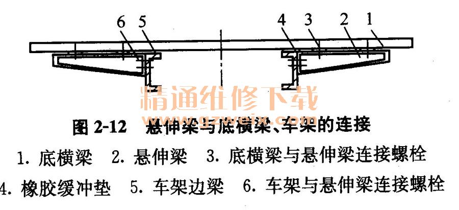 (1)非承載式車(chē)身 非承載式車(chē)身是直接在三類底盤(pán)的車(chē)架上組裝而成的,車(chē)架邊梁兩側(cè)的懸伸梁(俗稱牛腿)用螺栓與邊梁相連,底橫梁支撐在懸伸梁上,車(chē)廂側(cè)立柱與底橫梁焊接;為彌補(bǔ)懸伸梁與車(chē)架邊梁上平面度的誤差及緩和路面對(duì)車(chē)身的沖擊和振動(dòng),在底橫梁及懸伸梁之間安裝有橡膠緩沖墊,如圖2-12所示。