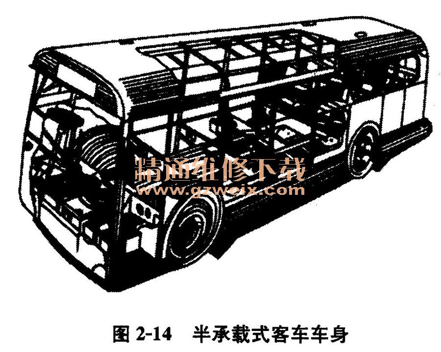(2)半承載式車(chē)身半承載式車(chē)身是一種過(guò)渡性結(jié)構(gòu),其車(chē)身下部保留有強(qiáng)度和剛度均較車(chē)架低的底架,車(chē)身骨架(立柱)的下端與底架縱梁兩側(cè)懸伸的橫梁剛性相連,車(chē)身下部與底架組成一整體(如圖2-14所示),因此車(chē)身也能分擔(dān)一部分彎曲和扭曲載荷,所以稱為半承載式。其優(yōu)點(diǎn)是可以降低整車(chē)重量。