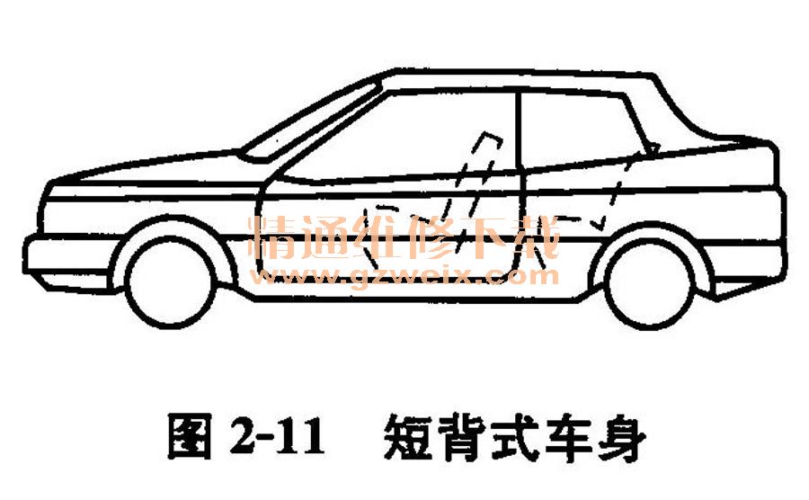 (4)短背式車(chē)身 這種車(chē)身由于背部很短而使整車(chē)長(zhǎng)度縮短,從空氣動(dòng)力學(xué)的角度考慮也是有利的;同時(shí),這種形式的車(chē)身可減少車(chē)輛偏擺,有利于穩(wěn)定性。這種車(chē)型也叫鴨尾式車(chē)身,如圖2-11所示。
