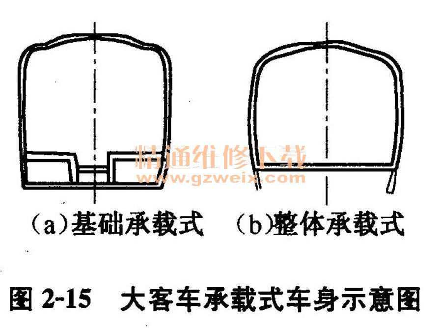 根據(jù)客車(chē)車(chē)身上下受載程度的不同,又可將承載式結(jié)構(gòu)分為基礎(chǔ)承載式和整體承載式兩種,如圖2-15所示。