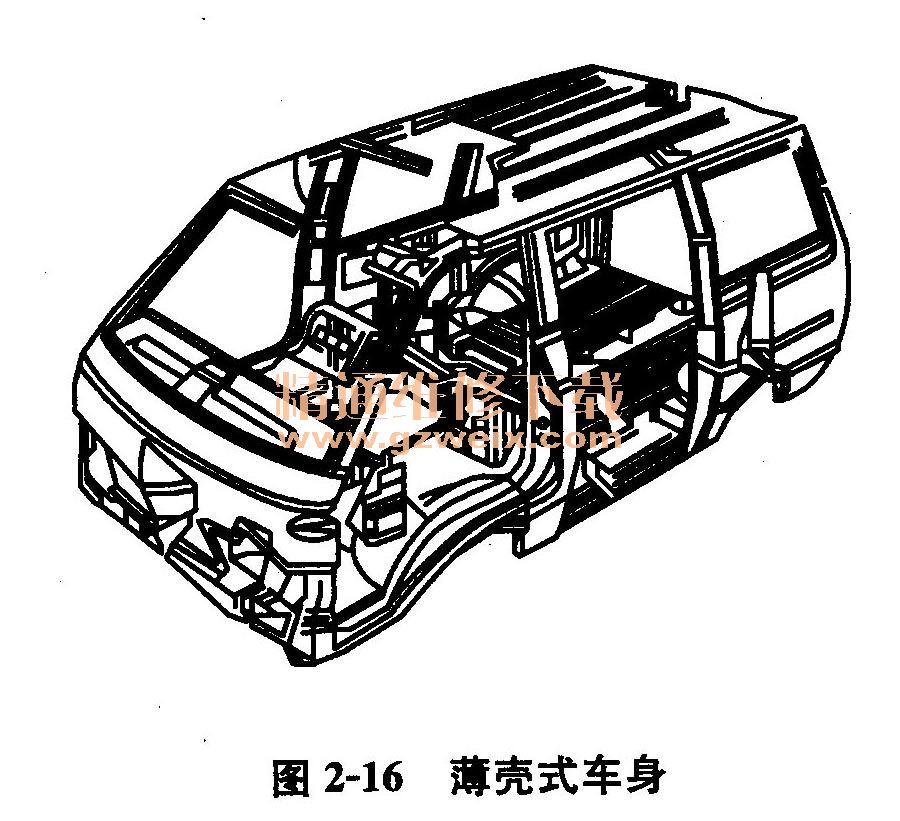 (4)薄殼式車(chē)身 薄殼式車(chē)身(如圖2-16所示)又稱為應(yīng)力殼體式車(chē)身結(jié)構(gòu),是飛機(jī)機(jī)身薄殼結(jié)構(gòu)的移植和運(yùn)用。它沒(méi)有像骨架式車(chē)身那樣的獨(dú)立骨架,構(gòu)成車(chē)身整體并取代骨架作用的是板塊式構(gòu)件,結(jié)構(gòu)應(yīng)力也由這些板式構(gòu)件承擔(dān),如頂蓋、車(chē)底、側(cè)板、車(chē)身構(gòu)件等。