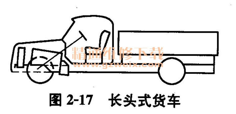 (1)長(zhǎng)頭式 長(zhǎng)頭式車(chē)身的發(fā)動(dòng)機(jī)布置在駕駛室之前,單獨(dú)有凸出的發(fā)動(dòng)機(jī)罩,如圖2-17所示。這種形式車(chē)身的發(fā)動(dòng)機(jī)維修方便,操縱機(jī)構(gòu)也較簡(jiǎn)單,汽車(chē)在路況較差的情況下通過(guò)性較好。其缺點(diǎn)是軸距和總長(zhǎng)相對(duì)較大,視野較差。所以長(zhǎng)頭式車(chē)身多用于中型和重型貨車(chē)。