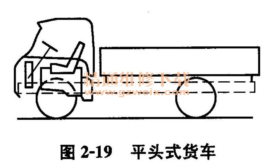 (3)平頭式。這種形式車(chē)身的駕駛室布置在發(fā)動(dòng)機(jī)之上,如圖2-19所示。汽車(chē)的軸距和總長(zhǎng)較短,機(jī)動(dòng)性好,視野良好,面積利用系數(shù)(載貨面積與總面積之比)高。為了避免駕駛室內(nèi)夏天比較悶熱等情況發(fā)生,駕駛室須加強(qiáng)隔熱、通風(fēng)、隔振和密封等措施。目前,由于結(jié)構(gòu)的改進(jìn)使平頭式車(chē)身的優(yōu)點(diǎn)比較顯著,因而它們?cè)诂F(xiàn)代輕型、中型貨車(chē)上得到了廣泛的采用。