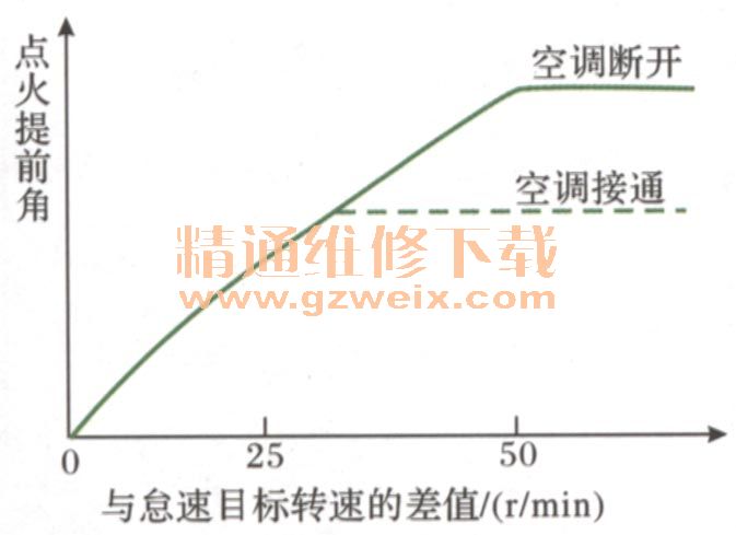 發(fā)動(dòng)機(jī)處于怠速工況時(shí),電控單元不斷地計(jì)算發(fā)動(dòng)機(jī)的平均轉(zhuǎn)速,當(dāng)發(fā)動(dòng)機(jī)的轉(zhuǎn)速低于規(guī)定的怠速轉(zhuǎn)速時(shí),電控單元根據(jù)實(shí)際轉(zhuǎn)速與目標(biāo)轉(zhuǎn)速差值的大小相應(yīng)地增大點(diǎn)火提前角;當(dāng)發(fā)動(dòng)機(jī)轉(zhuǎn)速高于目標(biāo)轉(zhuǎn)速時(shí),則減小點(diǎn)火提前角,如圖所示。