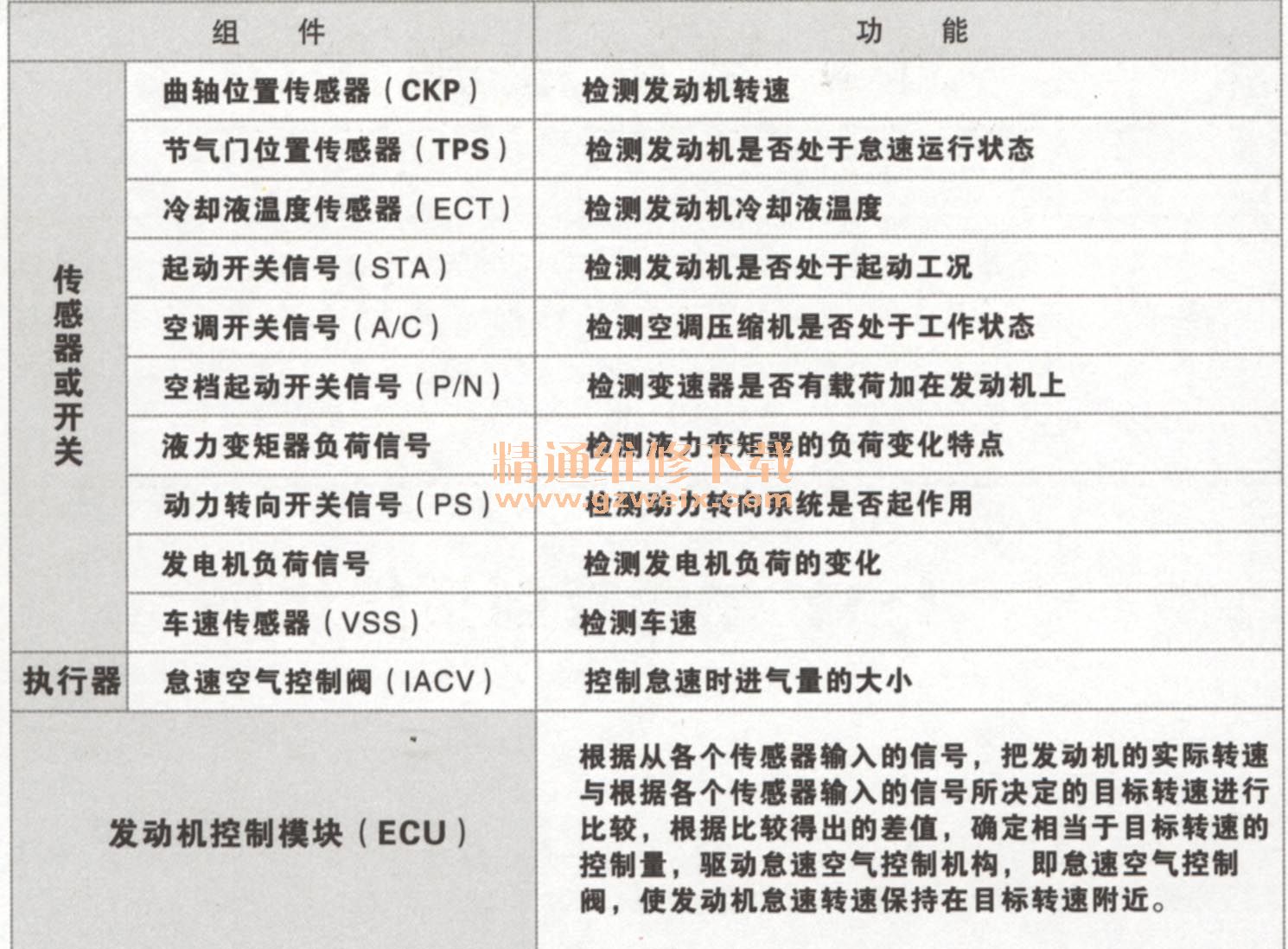 怠速控制系統(tǒng)組成如下圖所示,由各種傳感器、信號控制開關(guān)、電控單元、怠速控制閥和節(jié)氣門旁通空氣道等組成,各元件的功能如表所示。