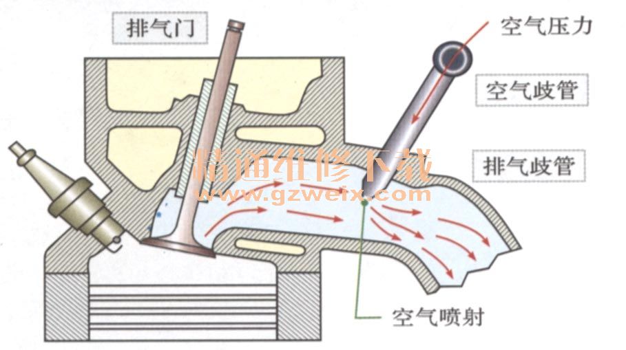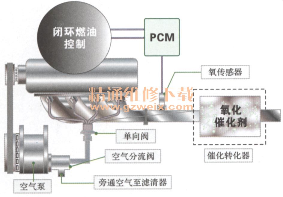 二次空氣噴射的作用:在一定工況下,將新鮮空氣送人排氣管,促使廢氣中的一氧化碳和碳?xì)浠衔镞M(jìn)一步氧化,從而降低一氧化碳和碳?xì)浠衔锏呐欧帕浚瑫r(shí)加快三元催化轉(zhuǎn)化器的升溫。