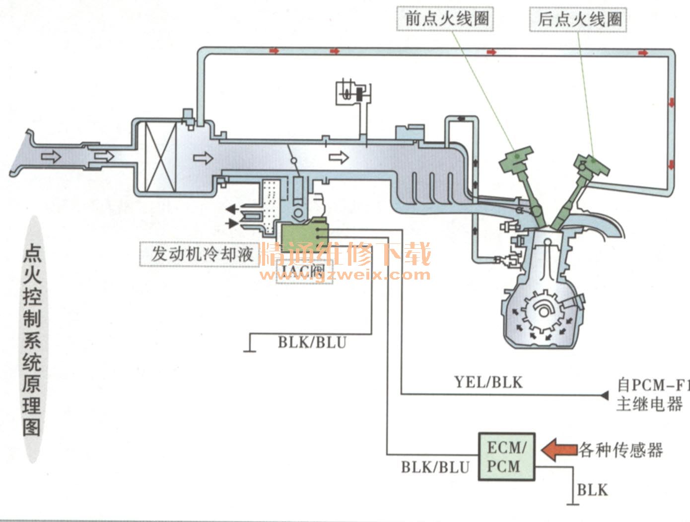 前點火線圈控制器ICM電源通過熔絲NO. 14提供,后點火線圈控制器ICM電源通過絲NO.15提供。ECM/PCM根據(jù)曲軸位置傳感器、凸輪軸位置傳感器輸人信號確定點火正時,并根據(jù)節(jié)氣門位置傳感器、爆燃傳感器、冷卻液溫度傳感器等修正點火提前角。ICM根據(jù)控制指令控制初級線圈的通斷實現(xiàn)點火。