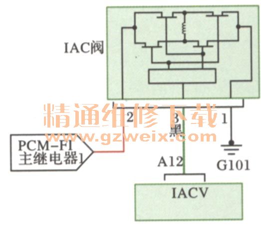 發(fā)動機怠速由怠速空氣控制(IAC)閥控制,IAC閥由PCM根據(jù)冷卻液溫度傳感器、節(jié)氣門怠速位置傳感器信號進行相應的控制。PCM根據(jù)信號通過對比實際的怠速轉速與理論怠速轉速,控制IAC閥打開或關閉旁通氣道進行怠速的控制。當發(fā)動機冷卻液的溫度較低時,IAC閥打開以獲得適當?shù)母叩∷伲酝ǹ諝獾牧扛鶕?jù)發(fā)動機冷卻液的溫度控制。IAC閥電路控制如右圖所示,IAC閥電源由PCM-F1主繼電器1提供,IAC閥端子1接地,端子3為控制端,接PCM#A12端子。
