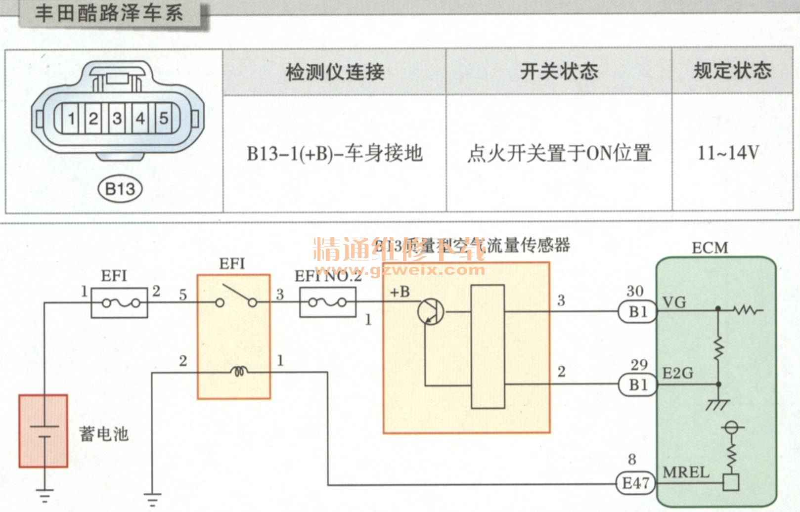 B端子:熱線(xiàn)式空氣流量傳感器信號(hào)輸出端,輸出的信號(hào)提供給電子集中控制裝置ECCS作為控制檢測(cè)信號(hào)。
