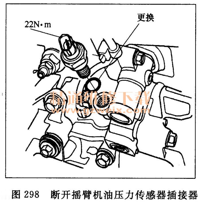 ①斷開搖臂機(jī)油壓力傳感器插接器,然后拆下?lián)u臂機(jī)油壓力傳感器(見圖298)。