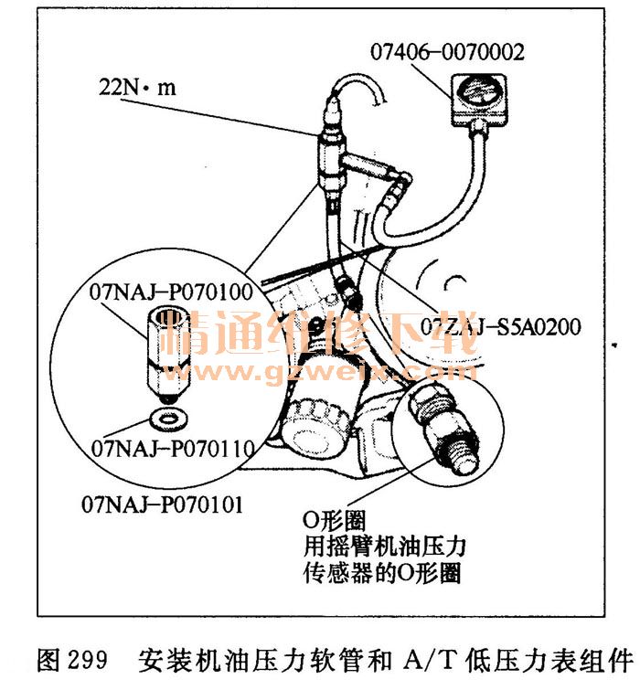⑦如圖297所示,安裝機(jī)油壓力軟管和A/T低壓力表組件,然后將搖臂機(jī)油壓力傳感器安裝到機(jī)油壓力表接頭附件組件上。
