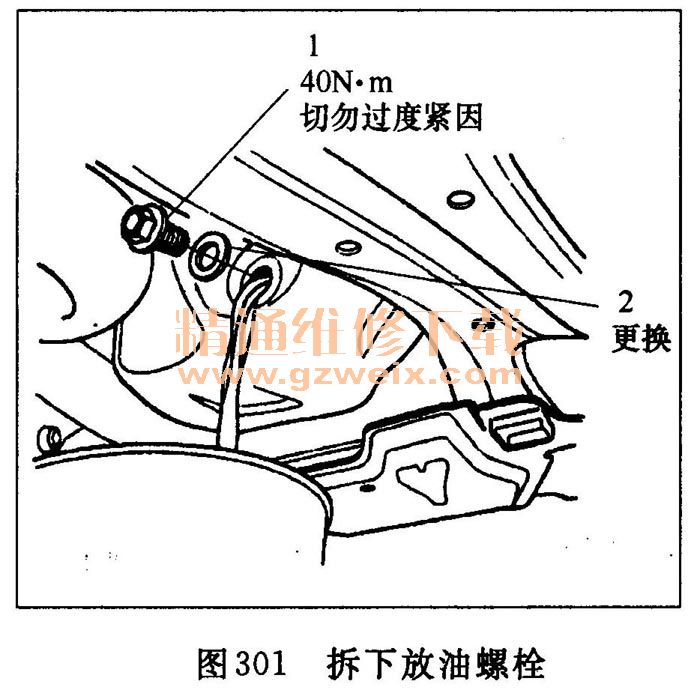 ②拆下放油螺栓1并排空發(fā)動機(jī)機(jī)油(見圖301)。
