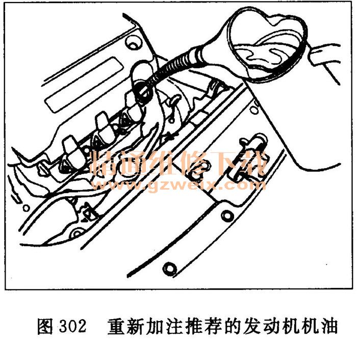 ④向發(fā)動機(jī)重新加注推薦的發(fā)動機(jī)機(jī)油(見圖302)。