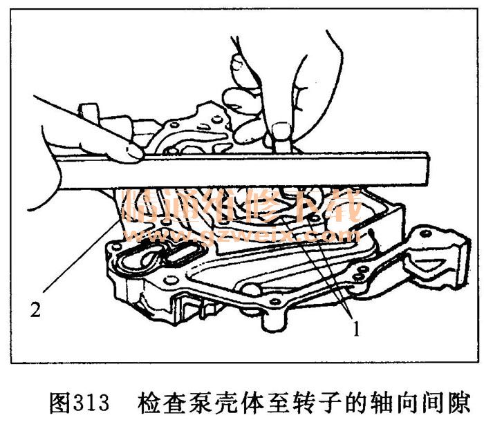 ③檢查轉(zhuǎn)子1和泵殼體2之間的泵殼體至轉(zhuǎn)子的軸向間隙。如果泵殼體至轉(zhuǎn)子的輛向間隙超出維修極限,則更換機(jī)油泵總成(見圖313)。