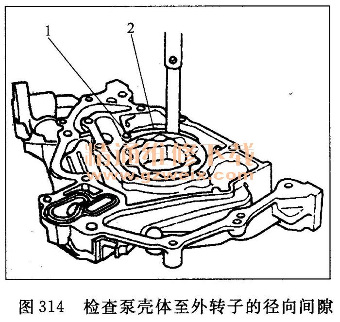 ④檢查外轉(zhuǎn)子1和泵殼體2之間泵殼體至外轉(zhuǎn)子的徑向間隙。如果泵殼體至外轉(zhuǎn)子的徑向間隙超出維修極限,則更換機(jī)油泵總成(見圖314)。