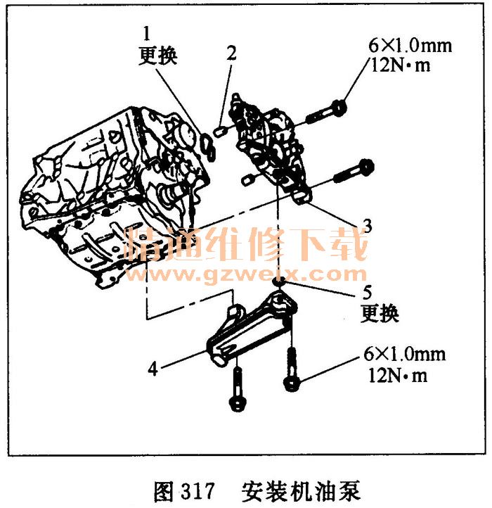 ③使用64mm的油封拆裝器,推動新的曲軸油封1直至油封拆裝器底部碰到機(jī)油泵(見圖315)。