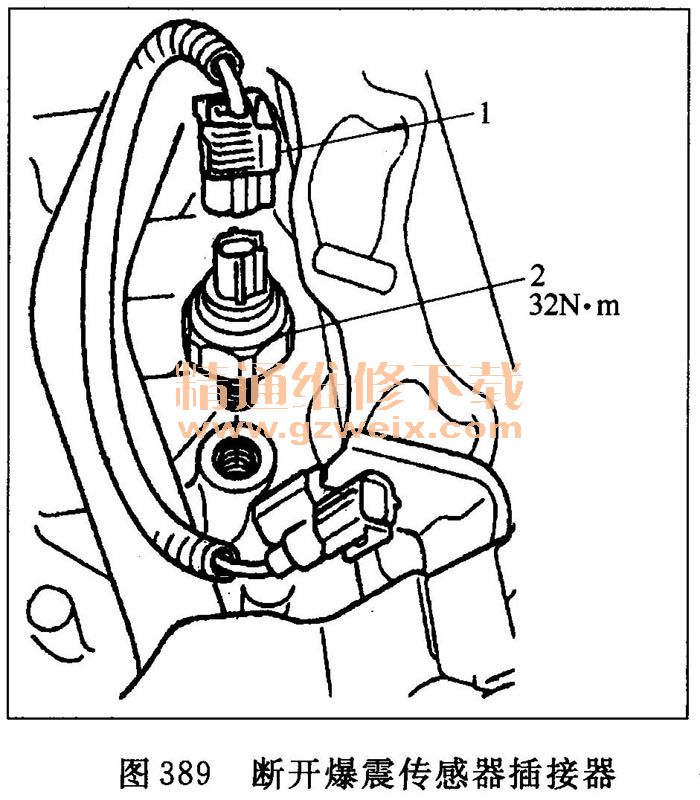 ③斷開爆震傳感器插接器1(見圖389)。
