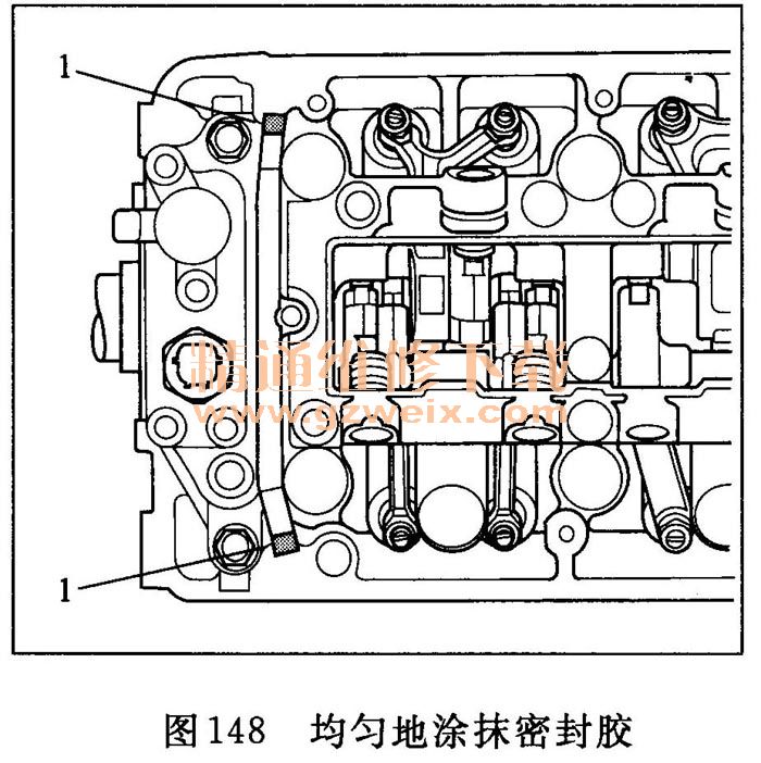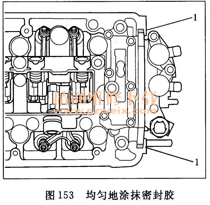 ⑥在搖臂軸托架的接合部位1均勻地涂抹密封膠(見圖153)。