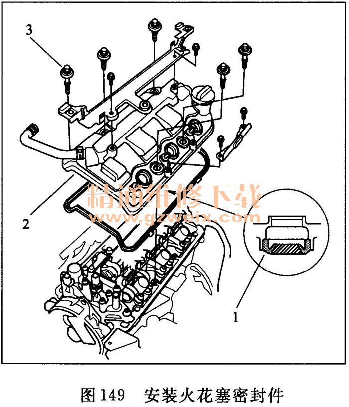 ⑦將火花塞密封件1安裝到火花塞套管上,并安裝前氣門室蓋2(見圖149)。