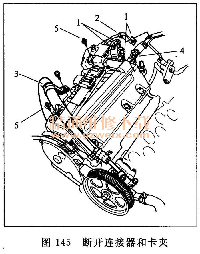 11將下列發(fā)動機線束連接器和線束夾從汽缸蓋上拆下: